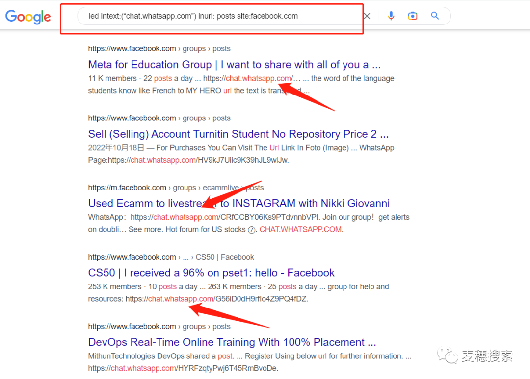 想要更細節的話(huà),可以從Facebook的帖子中搜索,可以輸入:led intext:(“chat.whatsapp.com”)inurl:posts site:facebook.com